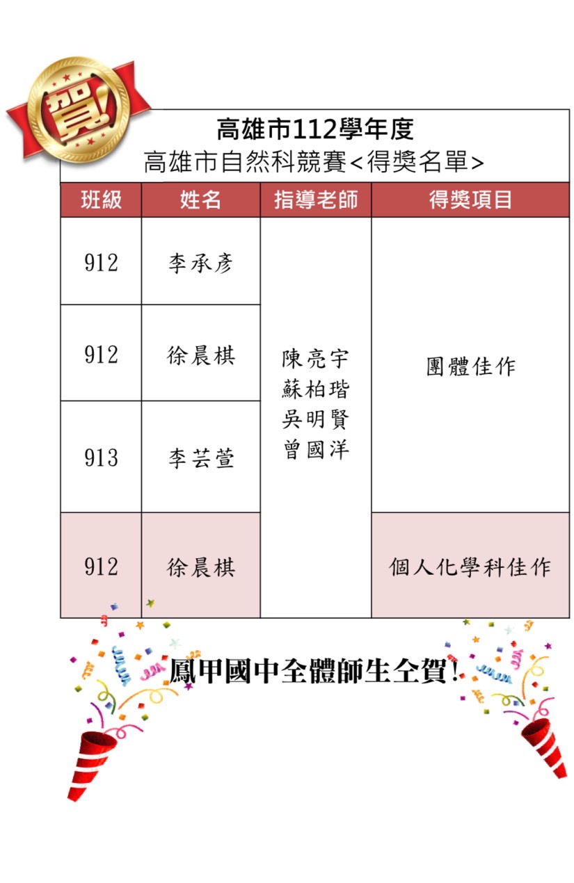 賀,本校參加112學年度高雄市自然科競賽榮獲佳績